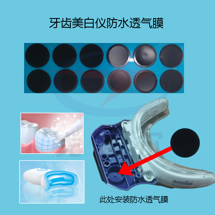 其實防水透氣膜就是一種新型的高分子防水材料。它能非常有效的隔絕水分。鹽分和一些帶有腐蝕性的液體。對產品起到保護的作用。我們把圓形的專用防水透氣膜安裝在牙齒美白儀的透氣孔處。這樣當大量的水進入美白儀內部的時。液體不會滲透到內部。同時還能夠迅速恢復透氣性。這樣很好的保護了美白儀內部的電子元件不受水的影響而導致產品出現問題。有了防水透氣膜的保護能快速的平衡密封腔體內外壓力。防止氣流積極。防水透氣膜的防水等級可以達到IP67-IP68標準。在30M到50M的深度產品都不會出現問題。